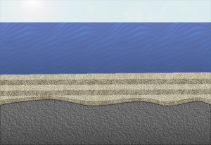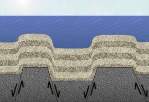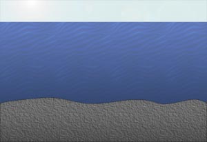 The oldest rocks in the Auckland area are sediments that were deposited in the deep ocean on a basement of unknown composition and age. Here we see the original basement submerged deep under water before the deposition of any sediments. |