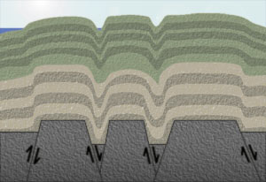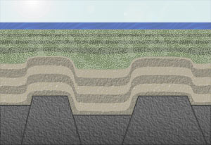 After a time gap of about 130 million years the greywacke and argillite became the basement rock when a new period of sediment accumulation began as the Auckland area was again submerged deep beneath the sea. This time the sand and mud were the product of the erosion and volcanic activity of chains of volcanoes to the east and west of the Auckland area, the remnants of which we now see as the Waitakere and Coromandel ranges. This occurred between about 23 and 5 million years ago. Here we see the sediments as they would have originally been deposited covering the new basement. |