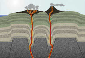 About 250 000 years ago the mantle beneath Auckland began to melt and form magma. Since that time, batches of magma have risen to the surface at varying intervals to produce the familiar volcanoes of the Auckland Volcanic Field. It is these volcanoes that give Auckland its unique landscape. Here we can see the magma rising along faults to the surface and erupting to form volcanoes. |